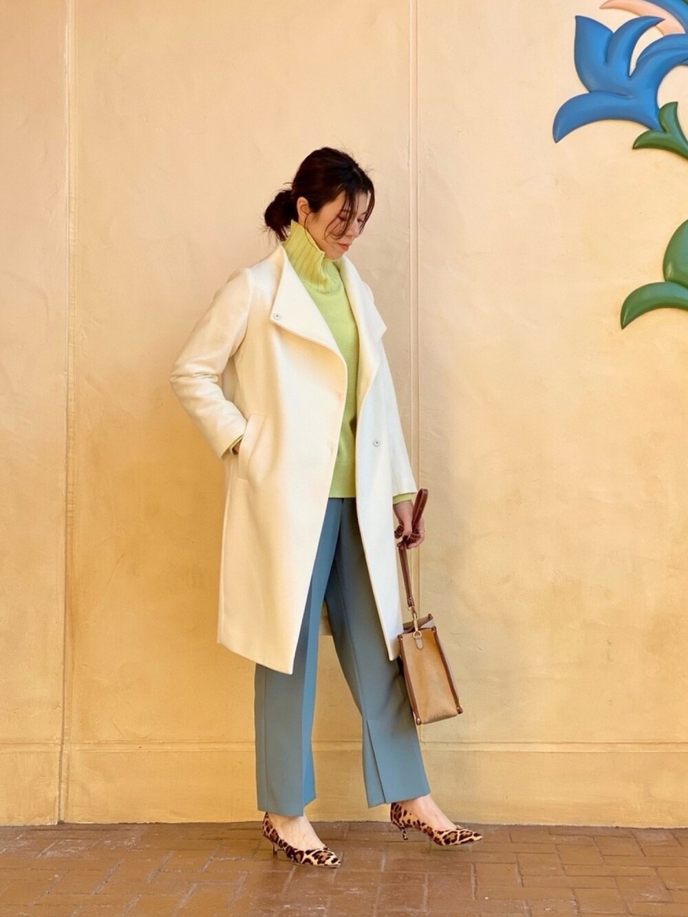 yuka(RIVE DROITE 池袋東武)のノーカラーコート「デイリーユースに取り入れたい ビーバーボトルネックコート (ボタン留め)」を使ったコーディネート