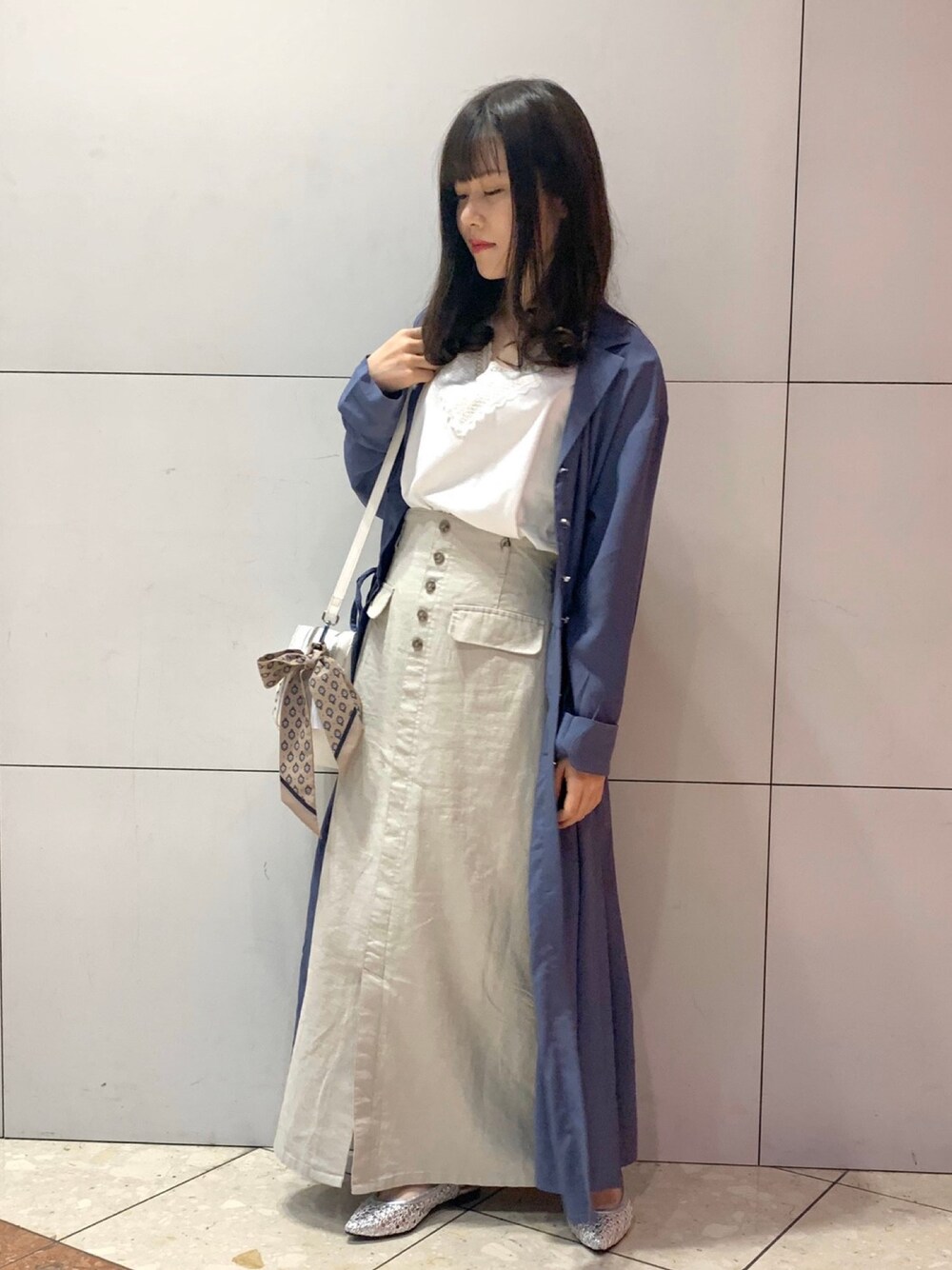 今年らしいブルーのお色味に白を合わせて 爽やか綺麗目コーデに仕上げました。 ロングスカートは高めの位置で履き、脚長効果を狙います。 ワンピのウエスト部分はギュッと絞り、前から見えるか見えないかにすることで縦のラインが強調され綺麗に見えます(^^)
