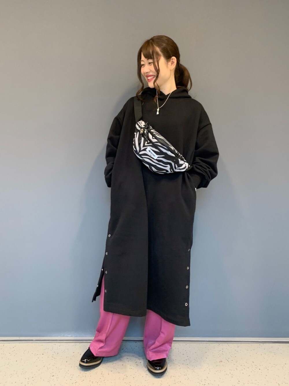 ご覧頂き、ありがとうございます😊🌸 ラフに着られる裏起毛のパーカーワンピは、そのまま着るとシンプルになり過ぎなのでグレープ色のパンツ×目線を上げてスタイル良く見せるためにボディバッグもインパクトのあるものを…😌✨ 楽にオシャレができるオススメコーデです💓