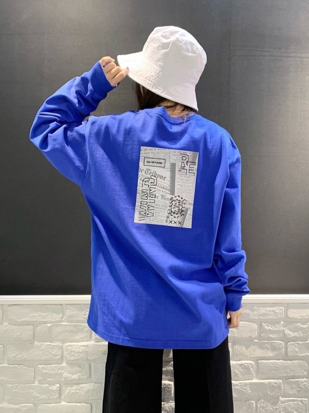 LIMのロンT見てください!! 派手すぎず、だけどオシャレに見えるブルーがオススメ色です🧡 バケハのホワイトを合わせることでカラーの統一感が出てセンス良く見えますよ🙆♀️ XLのゆるゆる感がたまらなく可愛かったのでサイズはXLを着てみました♫