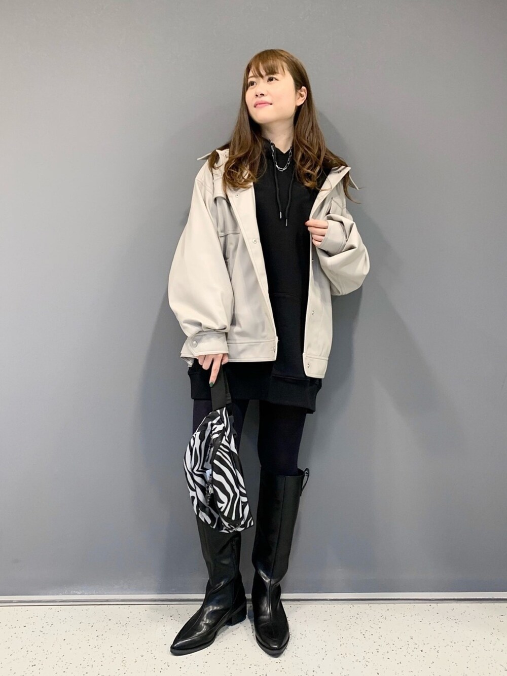 新色(クレイ)で入荷したレザージャケット!! やっぱり着やすくてオススメです❤️ ボリュームのあるニットの上に羽織るのがオススメ✨ LIMのパーカーをワンピ風に着て、タイツ×流行りのブーツを合わせてみました♫ ミドルブーツは暖かいし履きやすいのでオススメ!更にお値下げになってます🙆♀️ 低身長だから出来るコーデです❣️ 高身長はスキニーパンツを合わせると格好いい✨ ぜひお試しください😊