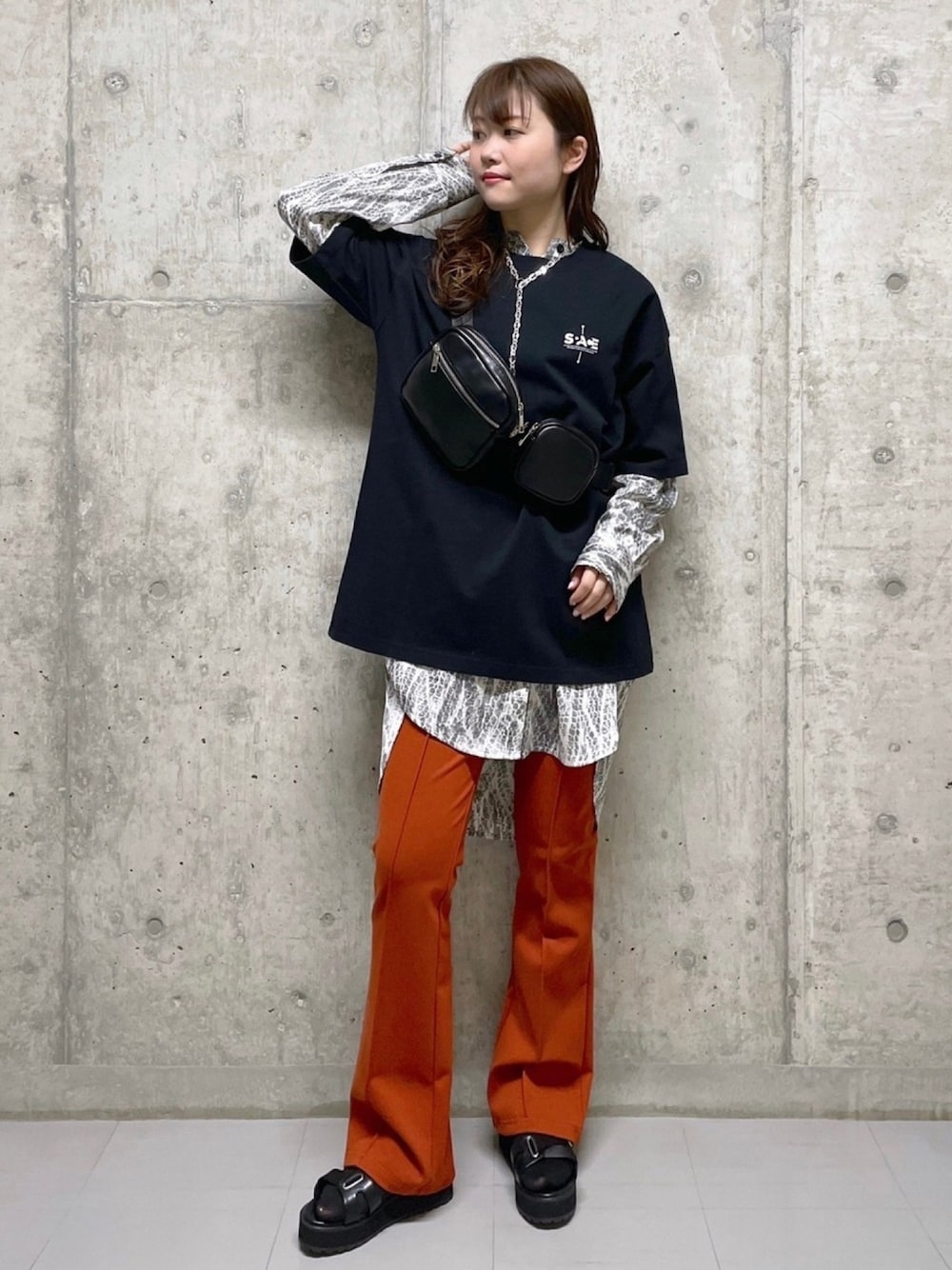 メンズライクに仕上げたい日にオススメなのはこのコーデ! パイソン柄のシャツがアクセントになります♫ 半袖の中から長袖を出すスタイルがこの時期ならではで良いっ★ 黒っぽいコーデなのでカラーパンツを合わせました♪