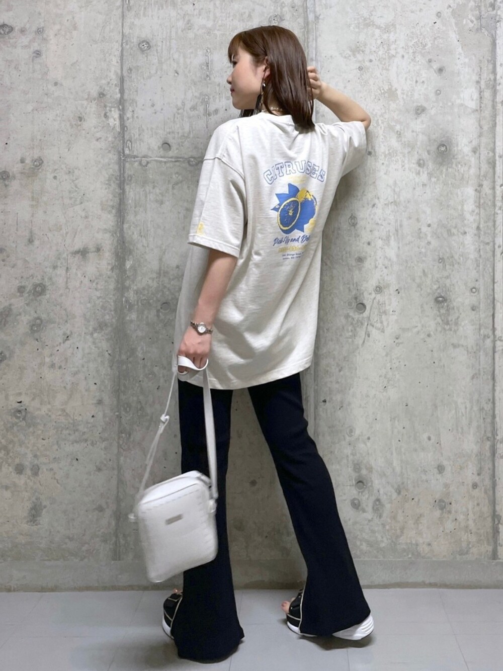 気になってたフルーツ柄Tシャツ! 全体的に色味がやわらかいので優しい雰囲気に★ 袖にデザインがあるのもワンポイント! さらに… 前後のギャップがあって可愛くないですか❤︎? Mサイズでも十分な長さがあります♫ 最近購入したヘザーのスポサンと合わせました! 調整がいろんなところで出来るから嬉しい☺︎