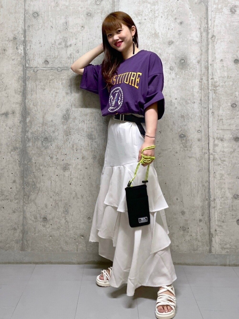 カジュアルな印象が強いパープルの色味に、可愛いをプラスしました★ 白のスカートで合わせることにより女の子らしく、可憐な雰囲気を纏うことが出来ます❤︎ デートでも、通学でも、テーマパークでも、ランチ会でも…万能な合わせです!