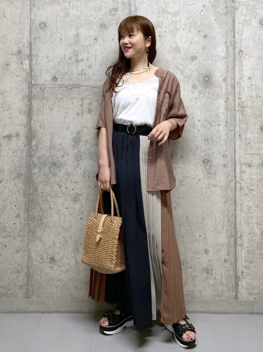 お出かけ用ファッション★ スカートをカジュアルに合わせたいって時にオススメです! 軽いシャツは日除けとしても大活躍間違いなし! 春夏っぽいカラーが苦手な方にオススメの色合いです。バッグとシューズで夏っぽさを出しました。 インナーのレースが可愛い! フレンチスリーブなので脇汗かいても安心♫
