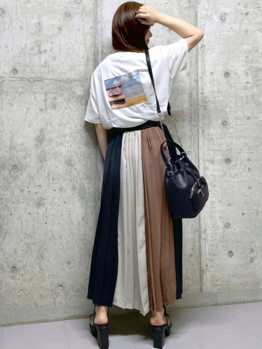 #オトナカジュアルコーデ バックプリントのカラーとスカートのカラーに統一感を持たせました☺︎ インしてもしっかりバックプリントが見えます! 大人気のスカート合わせでモードに。 ウエストはひとつ折って履いています。 プリーツがしっかり入っているので縦ライン効果でスッキリ見えます♫