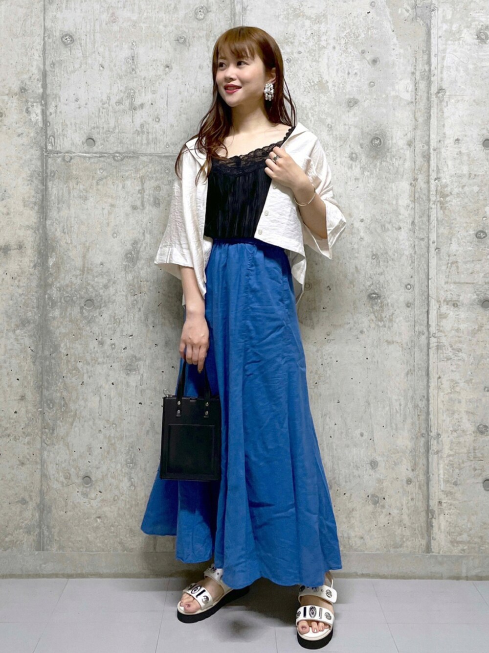 【staff boad▷▶︎みはで検索】 #みは流コーデ リアルバイした他ブランドアイテムとMIX! 鮮やかなブルーのスカートがほしくてゲットしました❤︎ ウエスト部分中に紐が付いているのでベルトいらず!軽い綿素材なので夏本番でも涼しく履けそうです♫ インナーは以前、白色を買ってすごく良かったので黒色を追加で購入! 開きすぎていない胸元、詰まりすぎてない脇周り。胸元の女性らしいレース感。 チクチク感なく着られるし、お洗濯後乾くのが早い気がします❤︎ PAGEBOYの新作ショートシャツがバランス良く合いました◎ 丈感、色味とっても可愛い! スカートスタイルでは大人キレイに仕上げてくれるし、パンツ合わせだとスタイリッシュでカッコよく仕上げてくれます❤︎