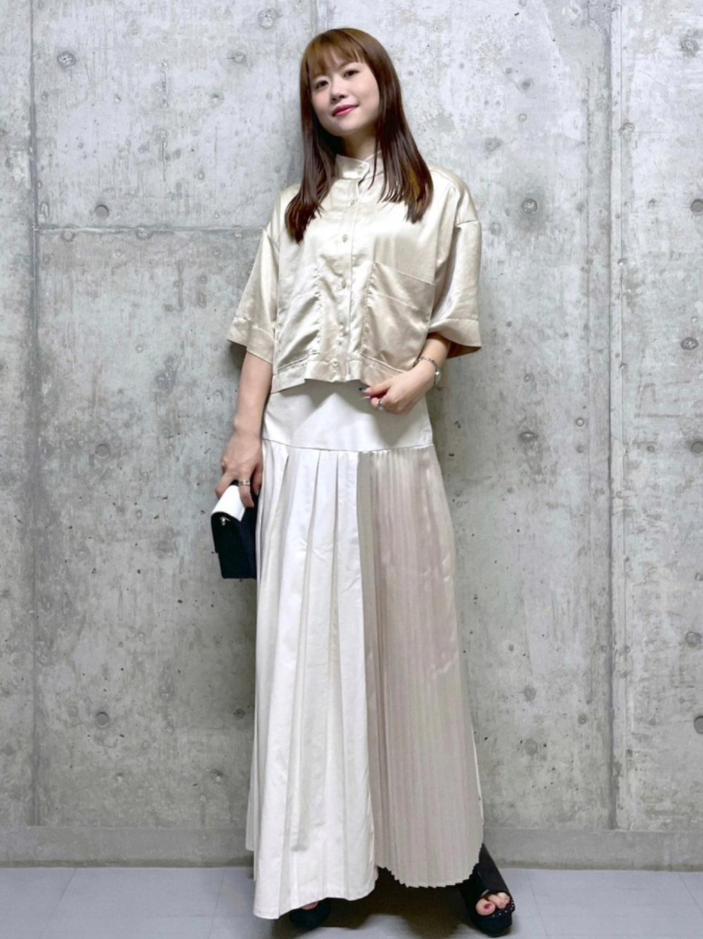 【staff boad▷▶︎みはで検索】 #ワントーンコーデ レザーライクのシャツとレザースカートを合わせました!! 周りと被りたくないって方必見のコーデです。 上下ともに光沢があるので高級感がありますね❤︎ バッグはショルダーをしまいクラッチバッグ風に仕上げました。 よりシックな印象に仕上がります♫