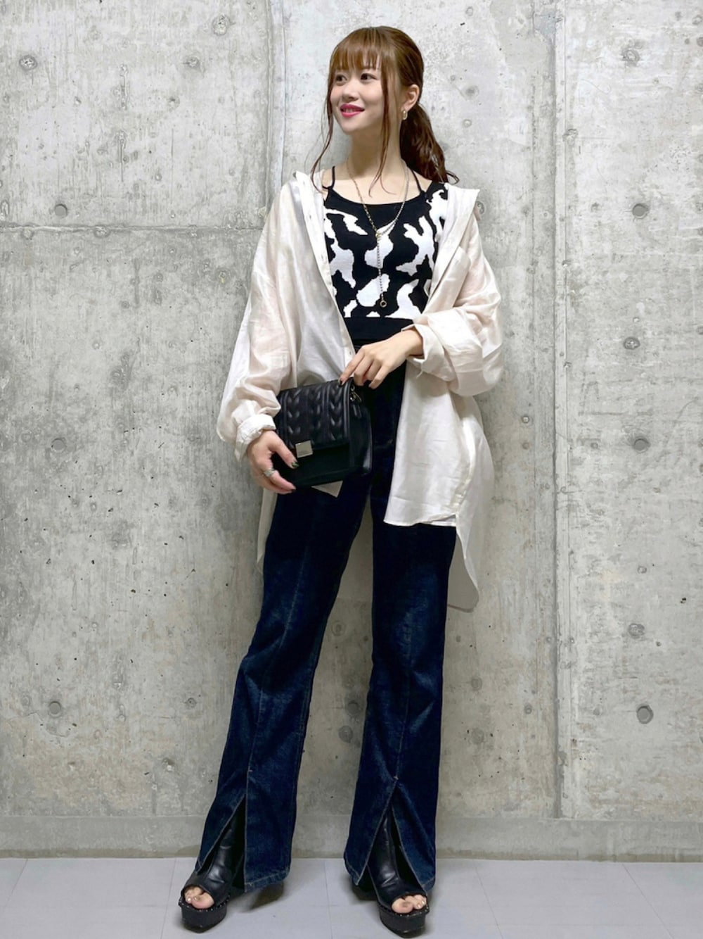 【staff boad▷▶︎みはで検索】 #オンナマエコーデ ベーシックスタイル(シャツ×デニムパンツ)にカウ柄のビスチェを入れるだけで一気にモード感溢れるコーデに…❤︎ シアーシャツは着心地良くて、特有の光沢感が高見えします。 長さがしっかりあり、袖も長めなのにスッキリ見えするのでスタッフ人気も、お客様人気も絶大♫ パンツは履いている内にすごく馴染みます。 今回履いているのはみはの私物。10回程履いて馴染んだデニムを着用しているので、是非参考にしてくださいね!(シューズも私物)