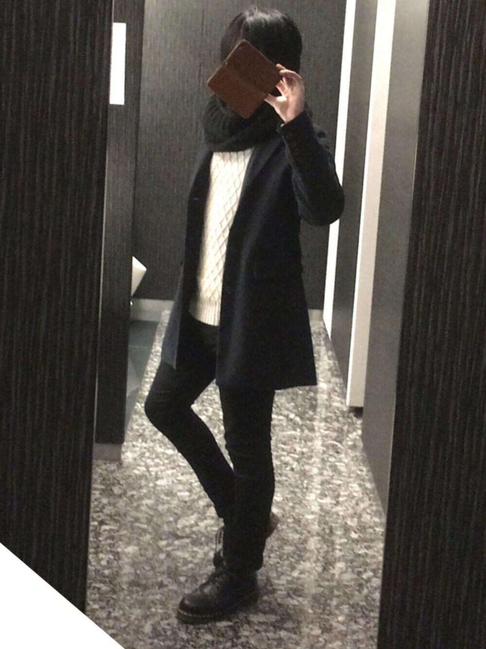 最近買ったネイビーのチェスターコートとスヌードでのコーデ! コーデのポイントは黒、白、ネイビーの3色だけしか使用してないのところです!