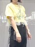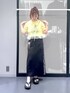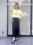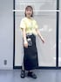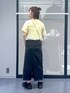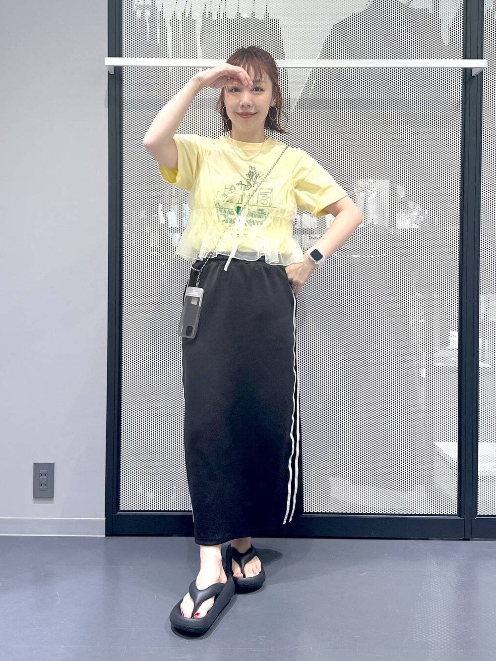 ⭐各アイテムのおすすめポイント  ̄ ̄ ̄ ̄ ̄ ̄ ̄ ̄ ̄ ̄ ̄ ̄ ̄ ̄ ̄ ̄ ̄ 【トップス】 💛 イエロー×グリーンのロゴがかわいいTシャツ! 夏はお洗濯ガンガンできるTシャツを着回します◎ 【ボトムス】 🖤 お客様とお店で盛り上がるった着回し力抜群のスカートです! 伸縮性抜群で、トラックパンツに比べてカジュアルになりにくいのがポイントです!! カラー違いも欲しい!