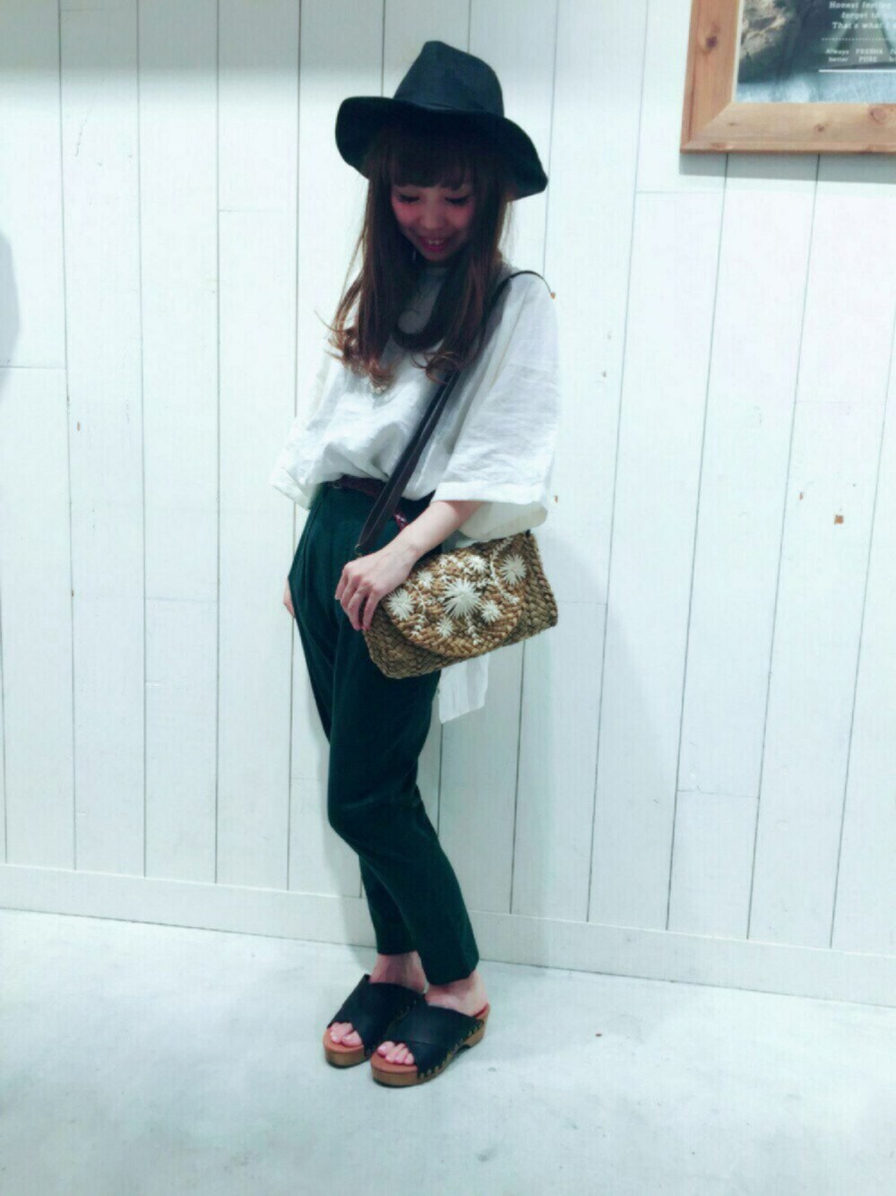 riya.(LAKOLE ラクア緑井)のハット「雑材シート中折れハット」を使ったコーディネート