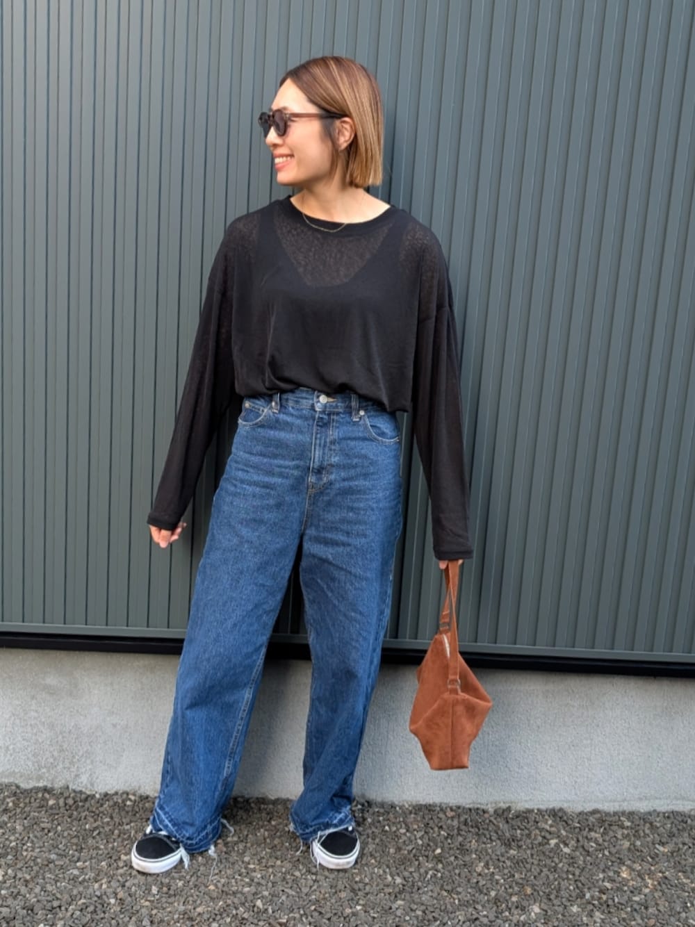 黒のシアートップスでシンプルに🖤差し色にブラウンで秋らしく🍂足の形を拾わないデニム👖でお気に入りです🤍