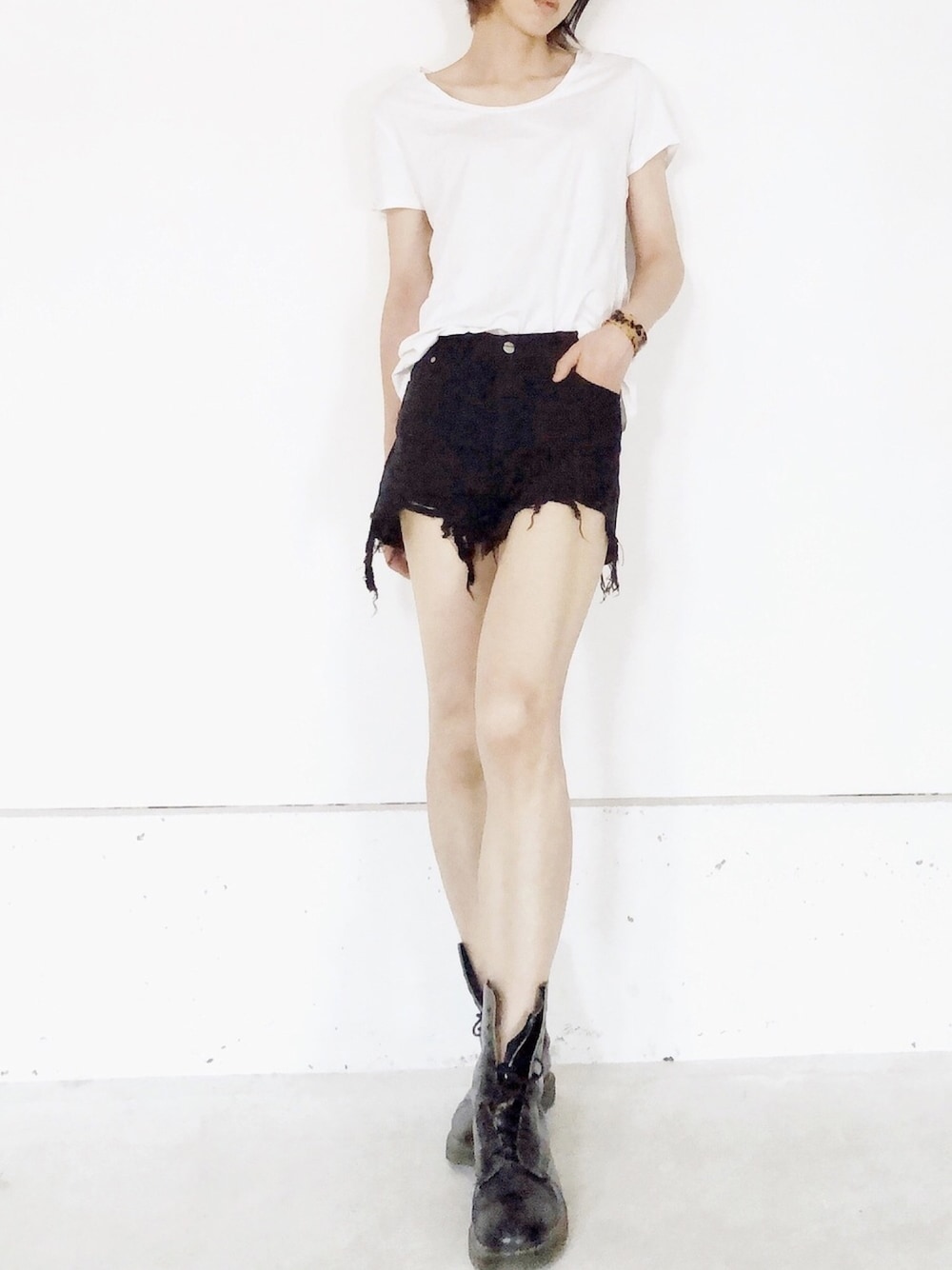 モノクロコーデ😘 大好きなDr.マーチンのレースアップは定番でかっこいい〜❗️ 新しい欲しいなぁ💜 ちぎられたみたいなショーパンは、こういうデザインですw 友達によくからかわれます笑笑 リヨ的には、ブリトニースピアーズやアギレラの気分ですw instagram riyo_model