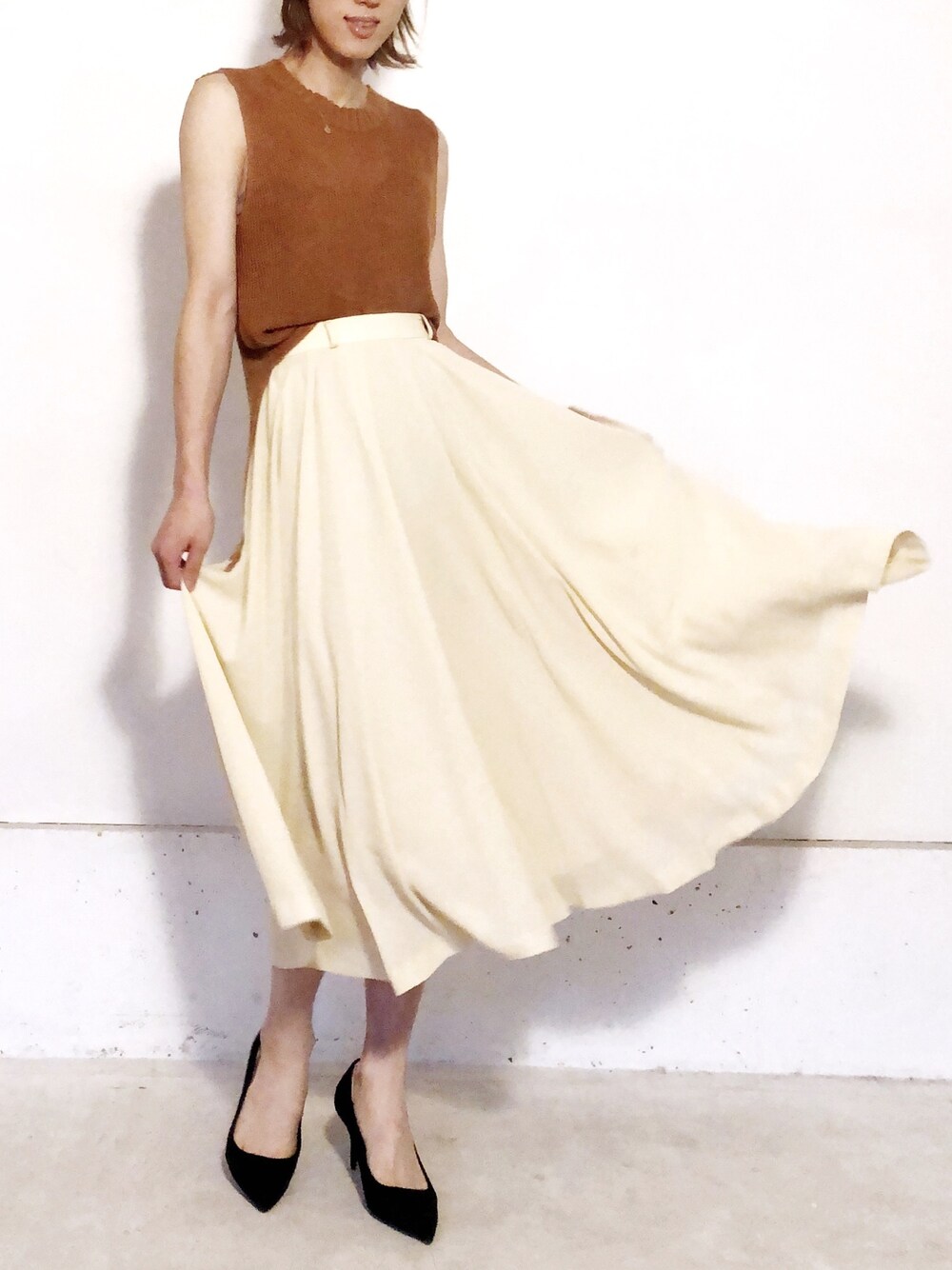 ノースリーブニットに80sスカート😋 すっごくフワッと広がる贅沢な生地使いが、今の時代の商品とは違う。 今なら素材ランクがおちたり、薄かったり、またはここまで広がらなかったり。 デッドストックの良い所はこういう事💕 しかも、全然今の時代のコーデにも素敵にマッチする💛💜☺️