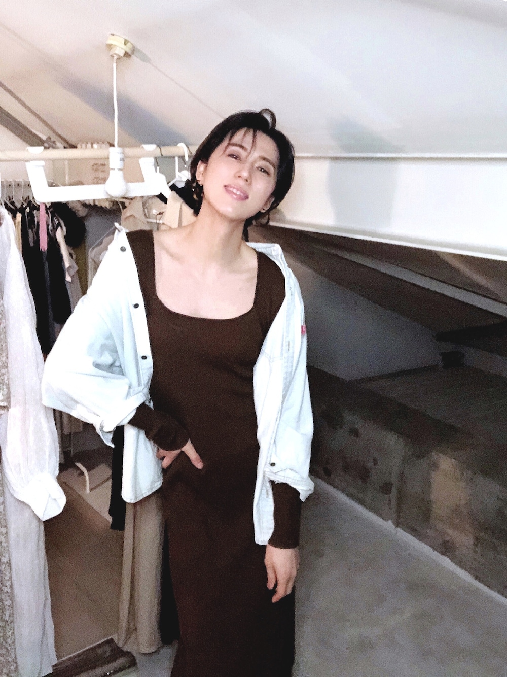 zaraのスクエアー開きマキシワンピース✌️ リブで着心地さいこう❤️ デニムシャツはオーバーサイズをチョイスして、大人カジュアルに😘 instagram🌈 riyo_model