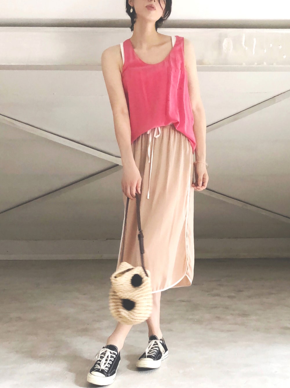ピンクのシルクタンクと、スポーティなベージュのとろみスカートでコーデ💗 instagram 👉 riyo_model