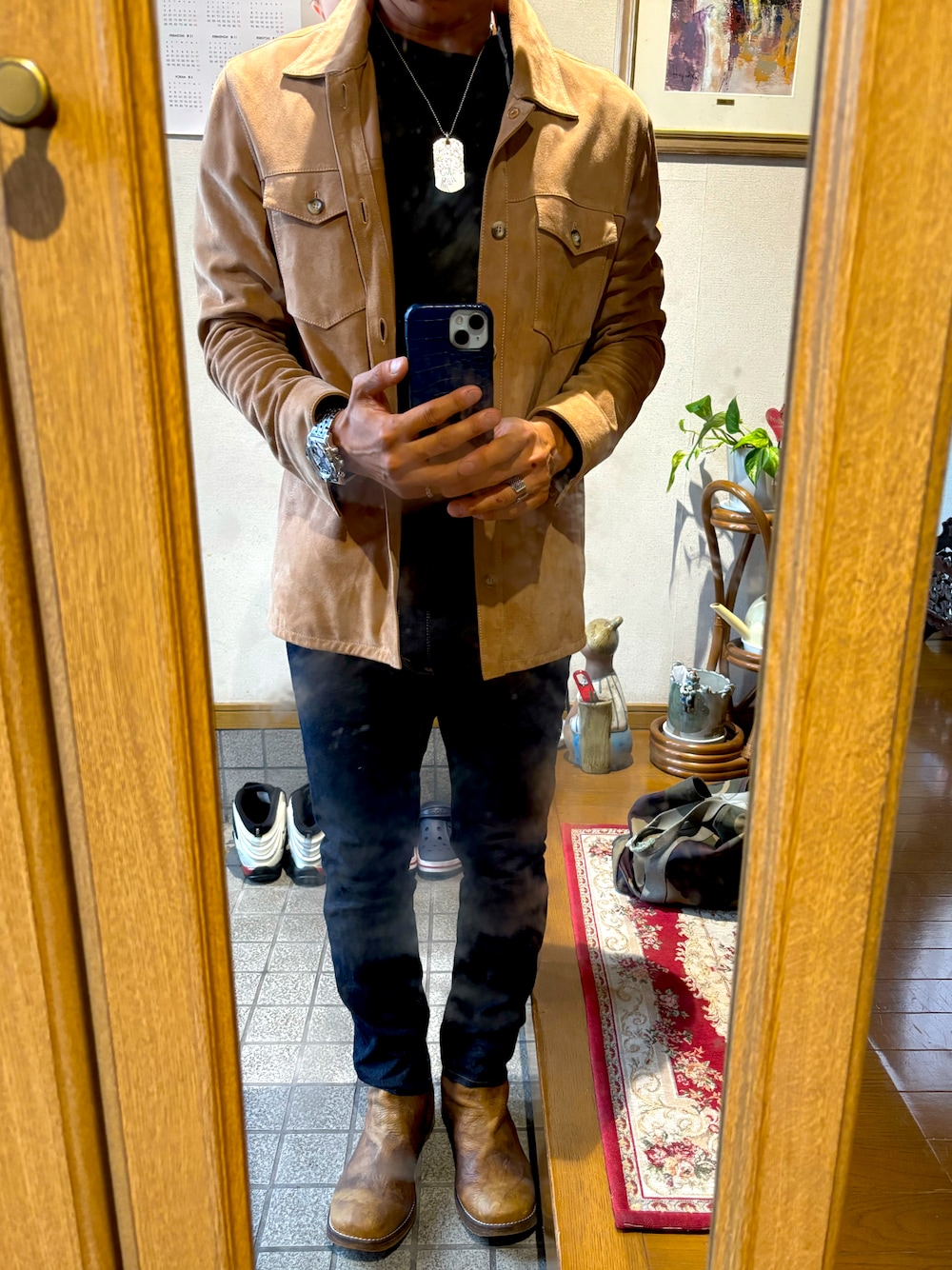 RIZEのその他トップス「ARMA アルマ スエード レザーシャツ 46 ジャケット寄りのシャツ ベージュ オランダブランド」を使ったコーディネート