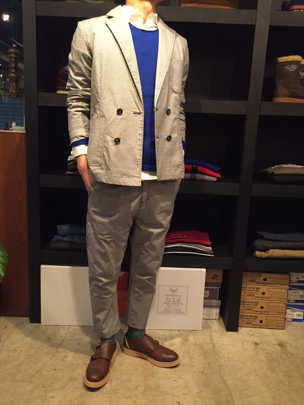 SET UPでかっちりとまとめてみました。 ただ、硬くなりすぎないよう爽やかなブルーニットを差し込み、パンツはクロップド丈で軽さをプラスしました。 結婚式の二次会スタイリングです。 https://rizm.stores.jp