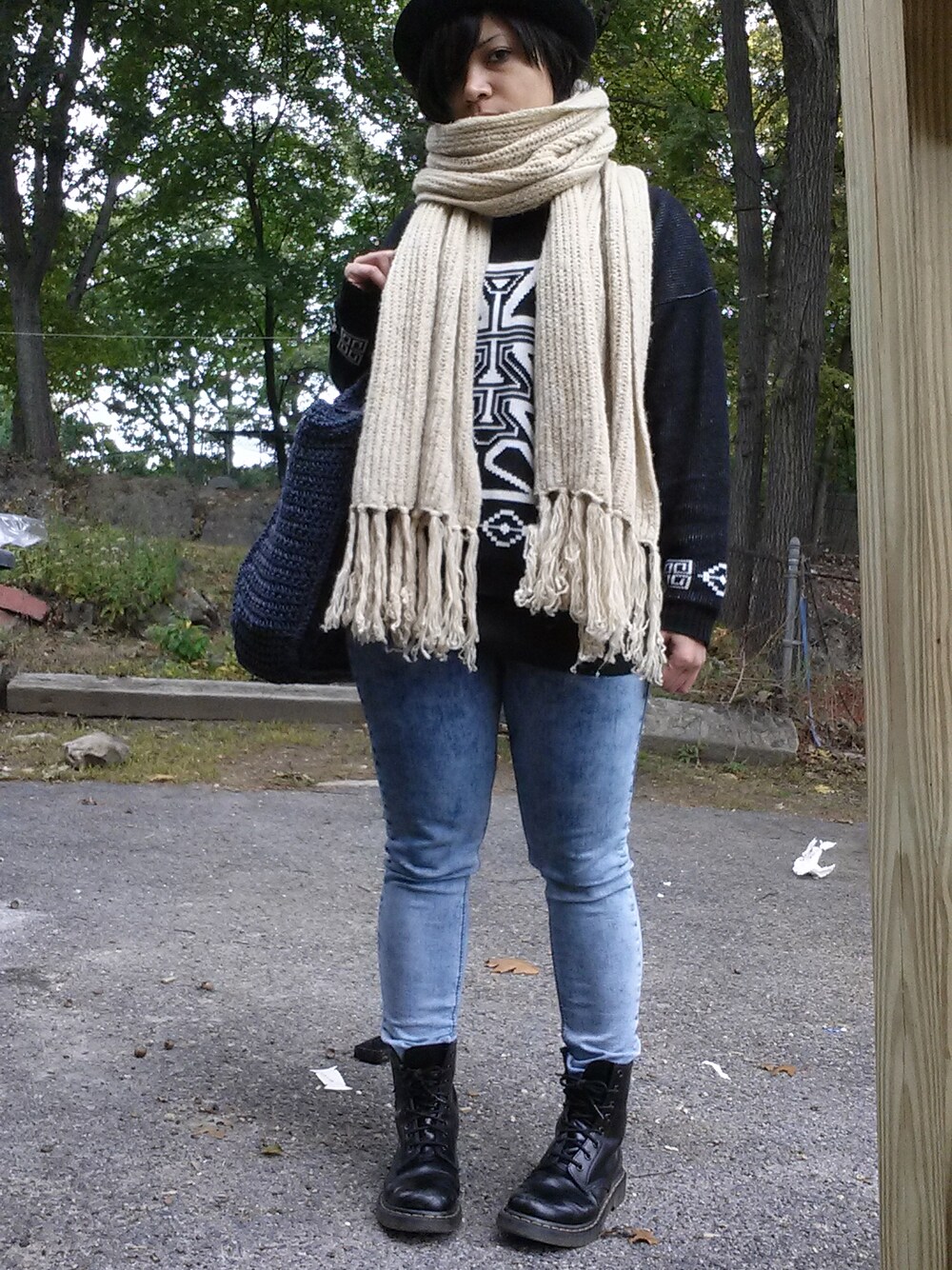its a bit cold and i don't have a jacket now so i layer sweaters. so its hard to see it but i have a dark green 'boyfriend' cardigan from old navy under my black and white thrifted graphic sweater. my scarf is also thrifted and my boots are Dr Martens. everything else is H&M.