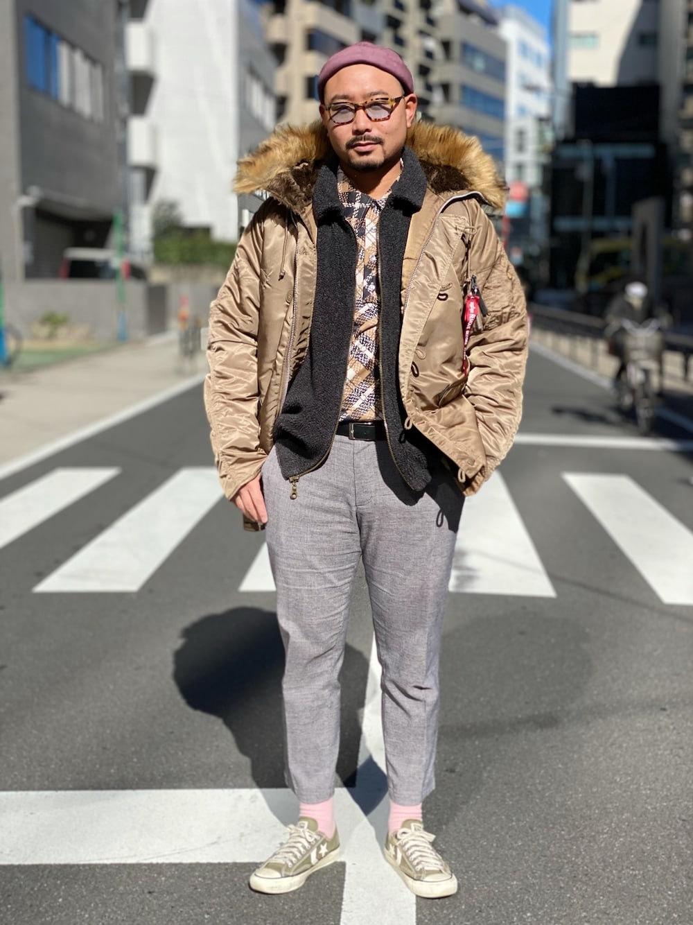 シャツ、アウター、サングラスフレーム 同じ色味で統一【チョコ色】 帽子、靴下 同じ色味【差し色】 自分STYLE
