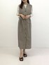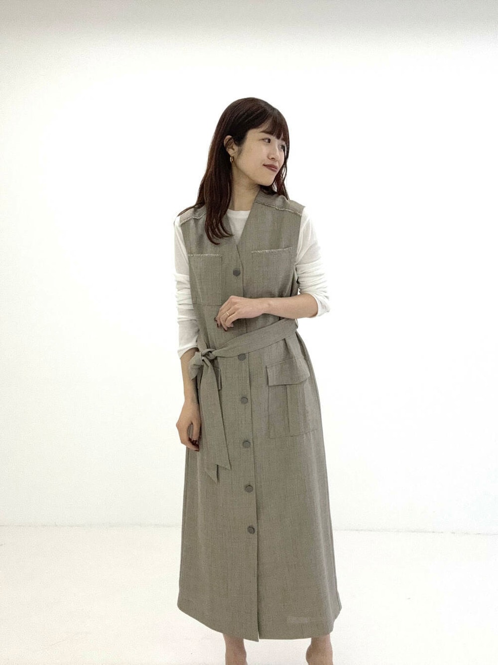 マニッシュな雰囲気のレイヤードワンピースを着用しました♪ 素材感は程良く厚みのある生地感で、太めのウエストベルトがスタイルアップも叶えてくれます◎Vネック仕様のため、インナーにシアーカットソーやレースカットソーを重ねた 着こなしがお勧めです。
