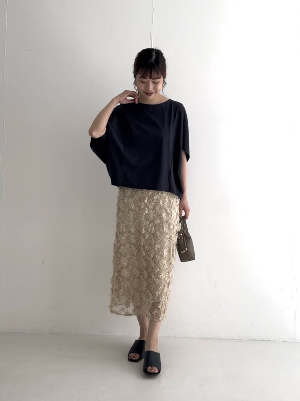 ラフに着こなせる、ドルマンプルオーバーを着用しました♪ 肘まで隠れる女性らしい5分袖丈が初秋まで使用でき、 程良い着丈も魅力ポイントです◎ 軽さのあるレースレイヤードスカートと合わせて、フェミニンな着こなしもお勧めです。