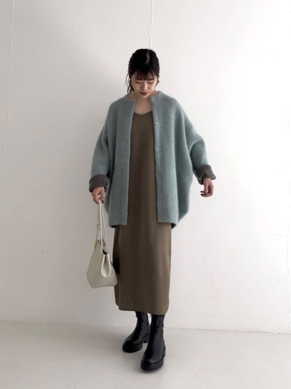 『別注』ELENDEEK×ROSSOのカーディガンを着用しました♪ 昨年も人気だったシリーズで、 上品な素材感とシルエットが誰もが虜になるアイテムです◎ 袖口をまくった際に見える配色もこだわりポイント。 配色と同じカラーで合わせた、サテンキャミワンピースで 素材感を楽しむコーディネートに仕上げてみました。