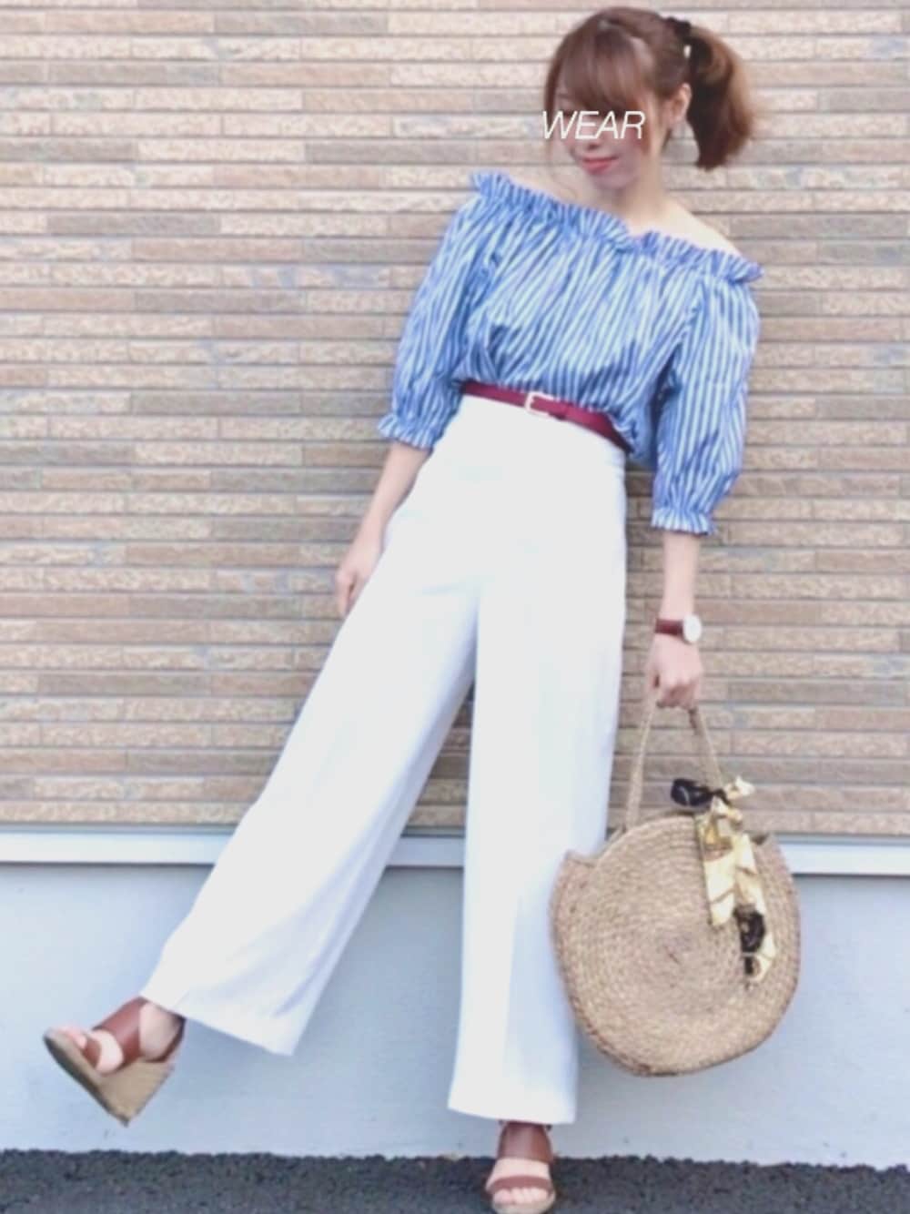 舞妓のシャツ/ブラウス「フリルストライプオフショルダートップス」を使ったコーディネート