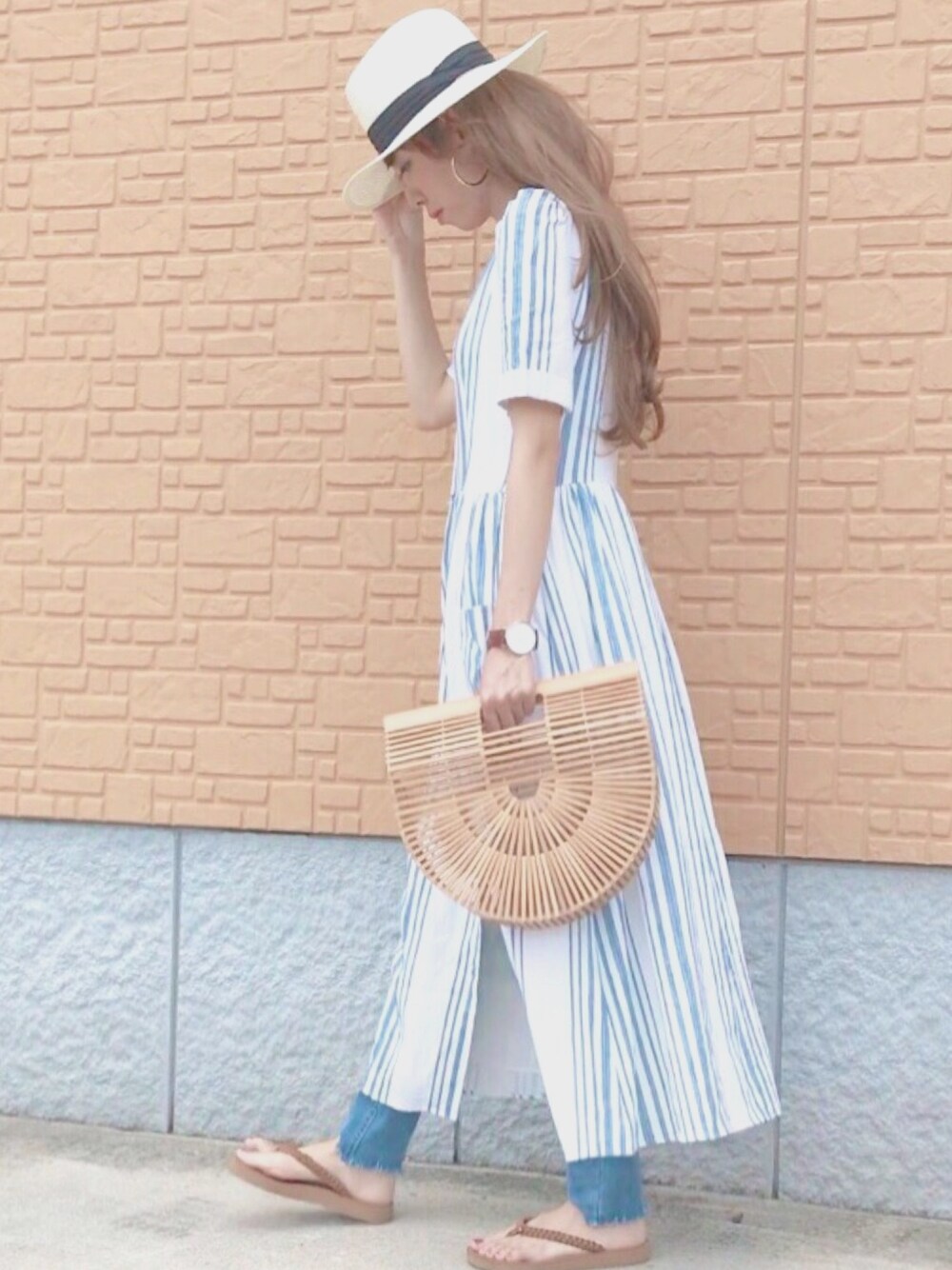 こんにちは☺︎ ZARAのストライプリネンワンピースに スキニーデニム、ビーサンコーデ 水色が1番好きです♡ ご覧いただきありがとうございました*°.☆.°*