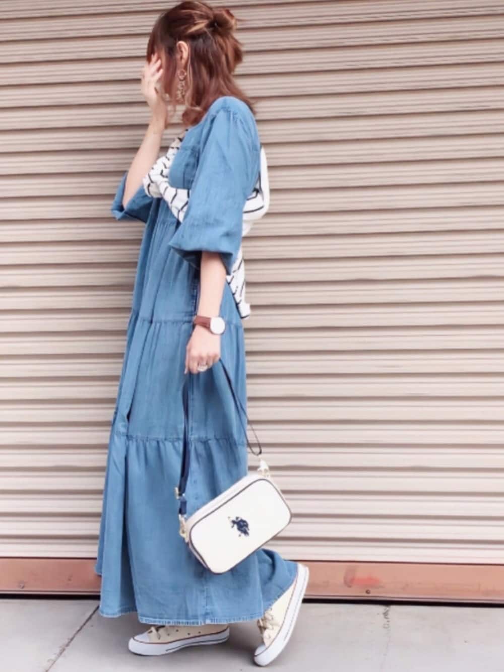Sonnylabel デニムティアードワンピース ボーダートップスのたすき掛けとスニーカーで カジュアルに ⌄̈⃝♩ いつもありがとうございます。 Instagram *⋆✈ wear_mai2