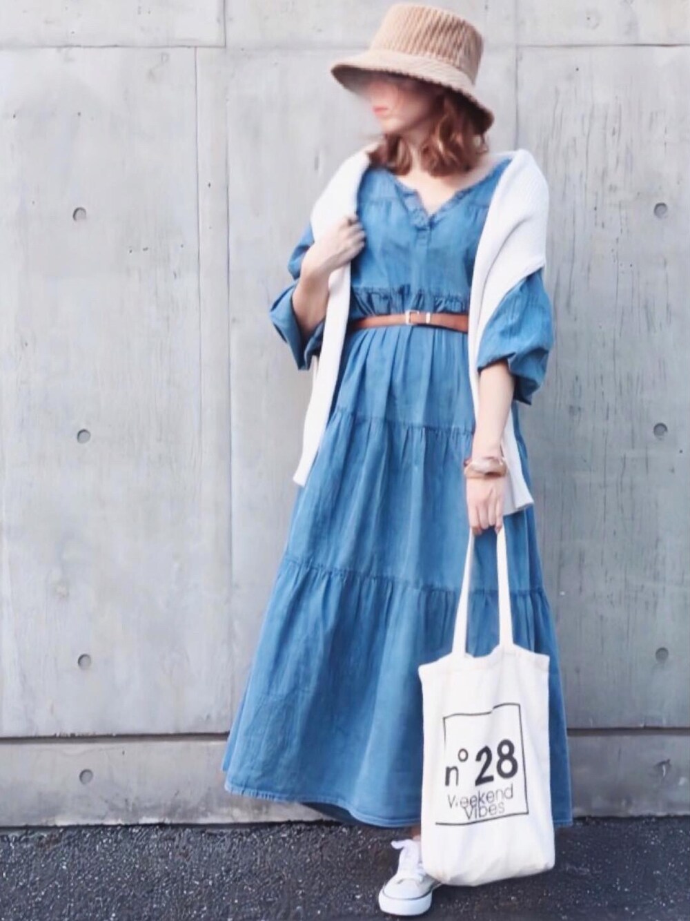 デニムティアードワンピース着回しコーデ 小物をエクリュ〜ブラウンカラーでまとめてみました⠉̮⃝ いつもありがとうございます。 Instagram *⋆✈ wear_mai2