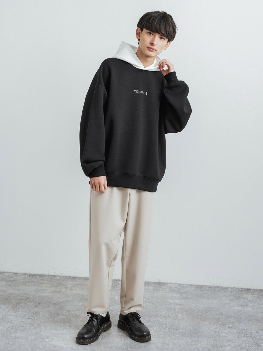 Rocky Monroe(Rocky Monroe)のパーカー「オーバーサイズ ダンボールニット ワンポイント刺繍クレリックプルオーバーパーカー」を使ったコーディネート
