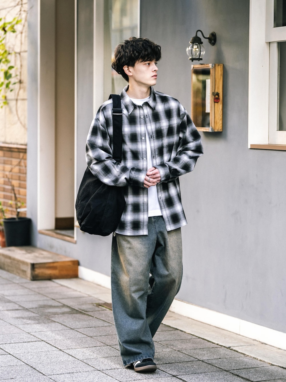 Rocky Monroe(Rocky Monroe)のシャツ/ブラウス「オーバーサイズ 無地 チェック柄 ストライプ柄 レギュラーカラー長袖シャツ」を使ったコーディネート