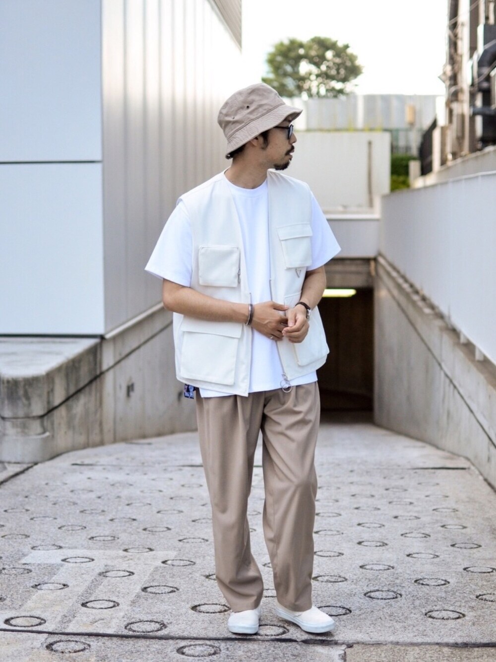 トレンドのフィッシャーマンベストを白とベージュでまとめました。シルエットをオーバー気味にしているので今らしいストリート感を演出しています。