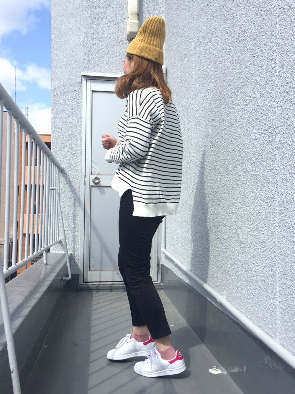 こんにちは、帽子専門店R.merryです☺︎ 来季AWニット帽の新作商品でコーディネートしてみました💛イエローのニット帽がシンプルなコーディネートのアクセントに💛 足元はピンクのスタンスミスでカジュアルに💞