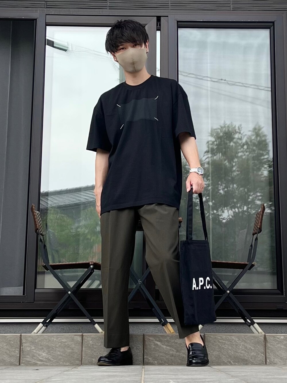 ご覧いただきありがとうございます。 いいね、お気に入り、フォローうれしいです。 Tシャツ×スラックスのキレイめカジュアルコーデです。ブラック×オリーブのお気に入りの色合わせでまとめました。マルジェラのTシャツのグラフィックがとても気に入ってます。 前回のコーデもたくさんのいいね、お気に入り、ありがとうございました。 とても励みになります。
