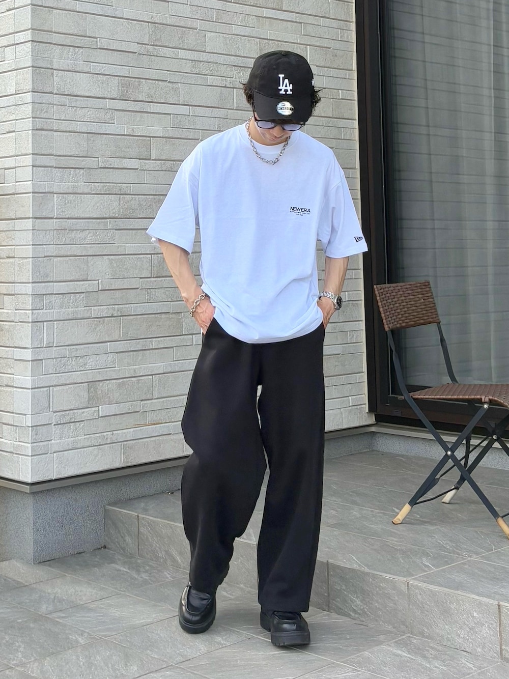 #PR #NEWERA #ニューエラ NEW ERAのキャップとtシャツを合わせたコーデです。tシャツのバックプリントがかっこいいアイテムです。キャップはLAのロゴが今っぽくていいですね。