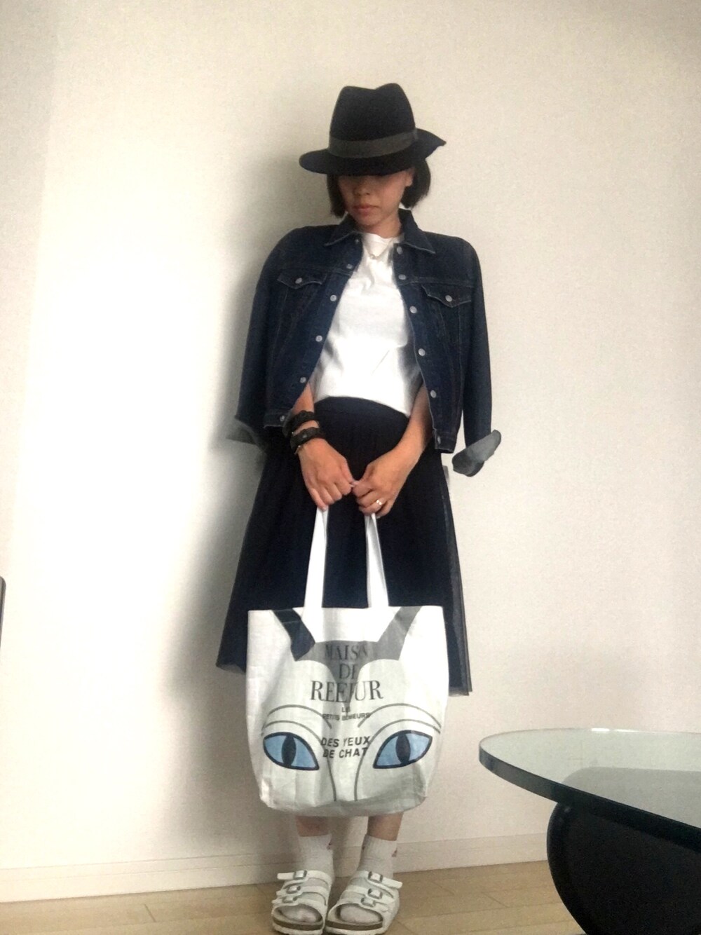 猫フェイスをプリントしたトートが甘さが出てクールなデニムジャケットでも可愛さの出るコーディネートです。