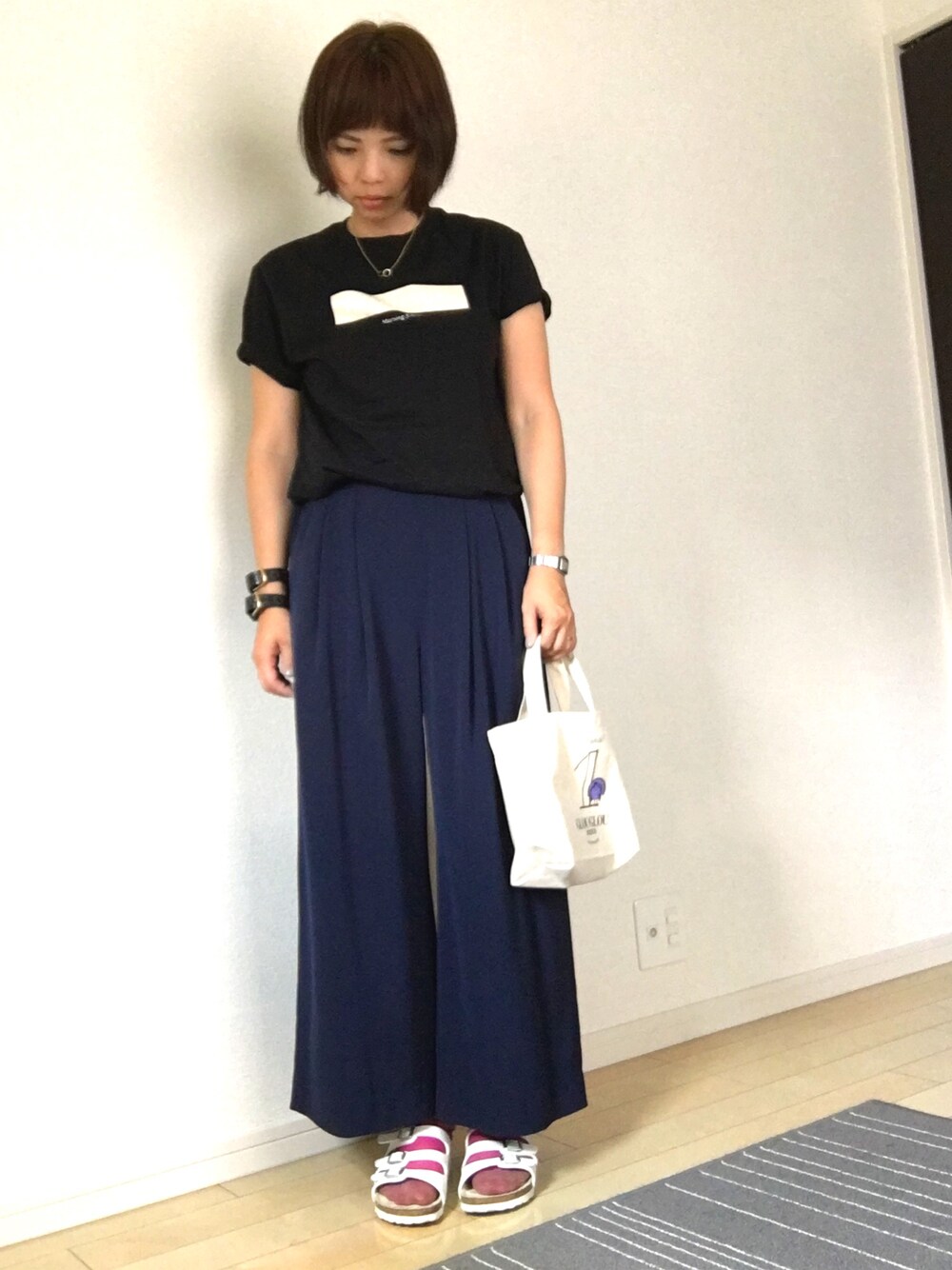 キレイなシルエットのワイドパンツで素材も優しく着やすい!Tシャツに合わせてもキレイに見えます。