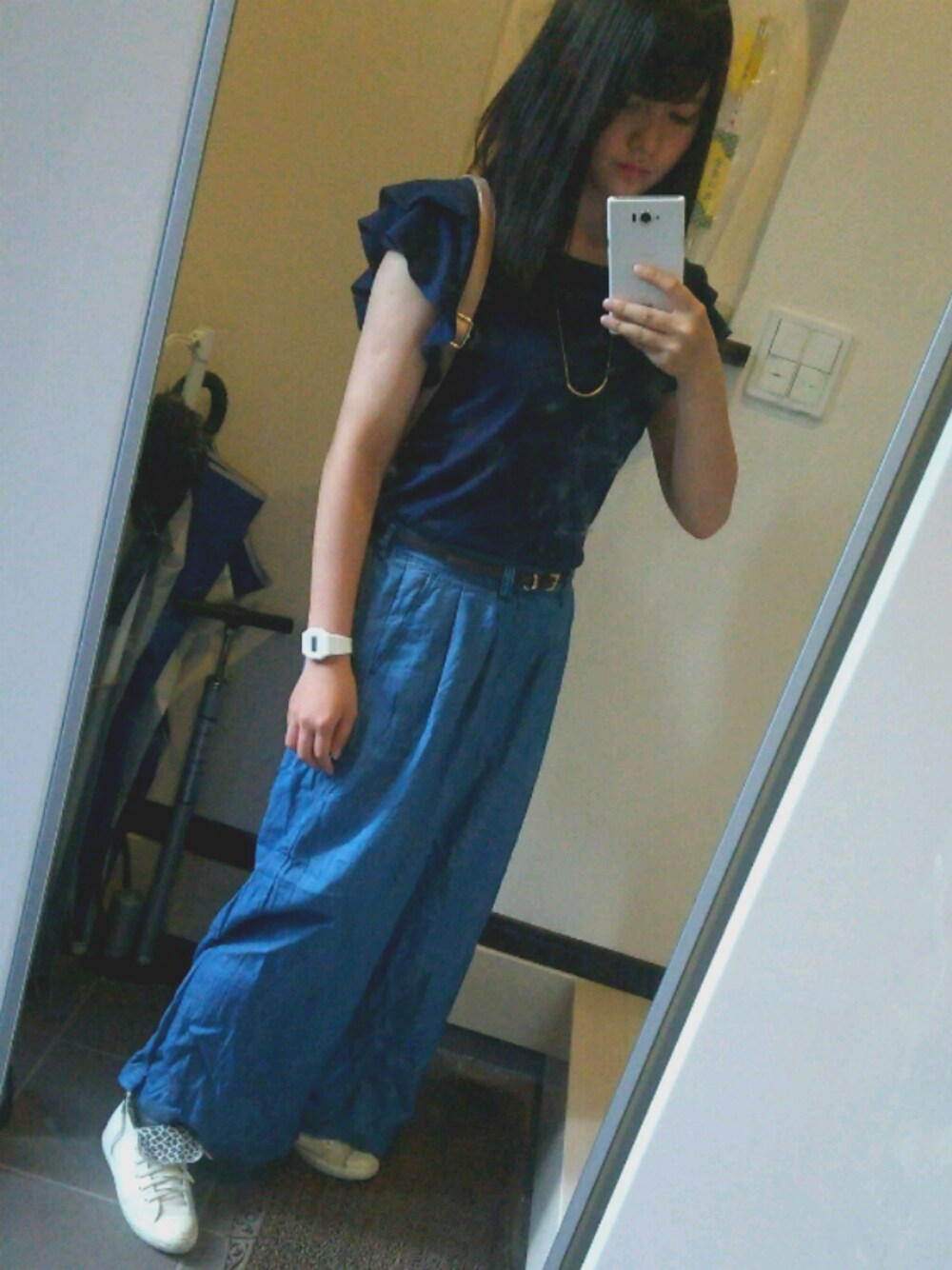 時間が無くて同系色でまとまった…(;o;) ワイドデニムがサラサラの生地で風も通してくれるしすごい歩きやすい❗❗ 靴はインヒールが少しはいった柄入りのコンバース♪♪♪