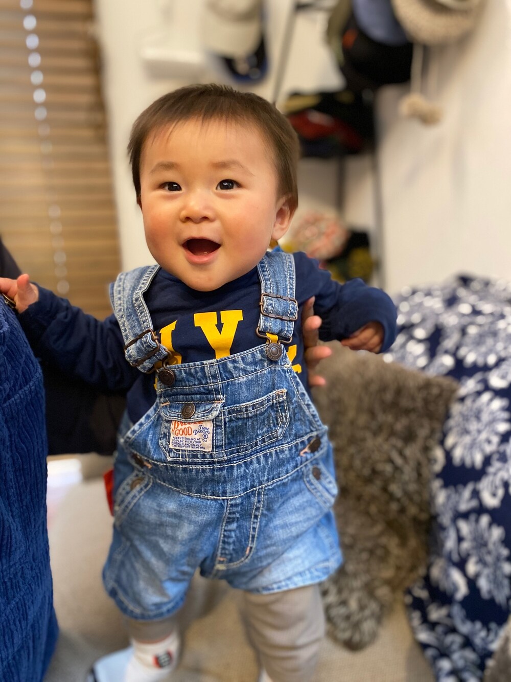 明日で8ヶ月😊✨ 7ヶ月目はハイハイ、ひとり座り、掴まり立ち、伝い歩き🙌 急成長すぎてついていけない🤣 って事で、たっちしてのショットに挑戦📸 暖かくなってきたのでショート丈のサロペット🤗