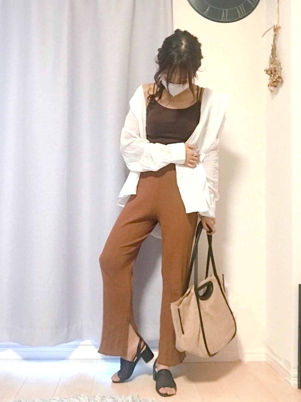 お目に留めていただき ありがとうございます♡ 買い出しコーデ 全身プチプラです◡̈*.。 GRLのニットパンツは内側に スリットが入っているのがお気に入り♡ カップ付きキャミ × シャツは 本当に楽ちんすぎて この夏お家コーデの定番です