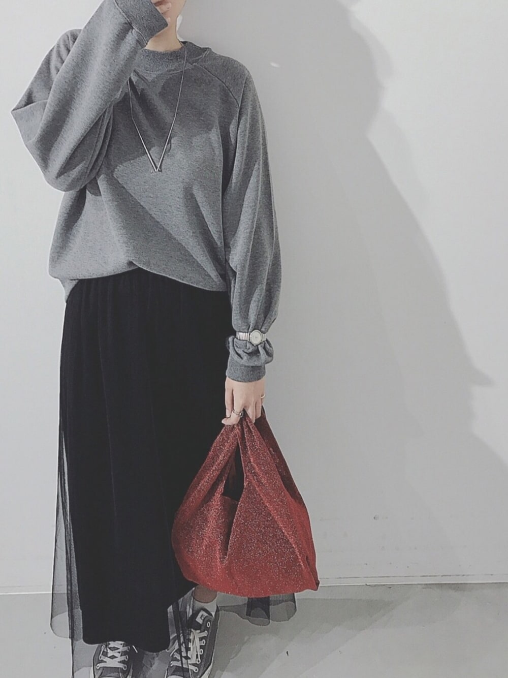 今日はkoe 3rdアニバーサリー記念の プルオーバーを着用したコーデです ✌︎ ボリュームたっぷりの袖がかわいい! 黒のチュールスカートと合わせて、 安定のモノトーンコーデです。 赤のラメバッグはマルシェ型なので 荷物が多い日も安心!◎