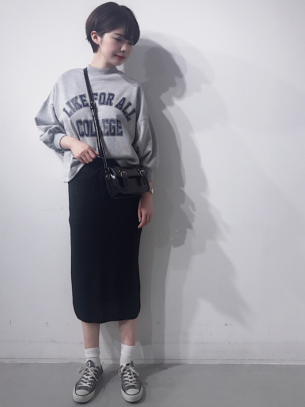 ゆったりしたボリュームのある袖が特徴の ハイネックロゴトレーナー。 デニムパンツと合わせてがっつりカジュアルも良いけど、 あえてニットスカートと合わせてみました 𓅪 足元はスニーカーにしましたが、 もう少し暖かくなったら きれいな色のパンプスを合わせても可愛いかも 👠