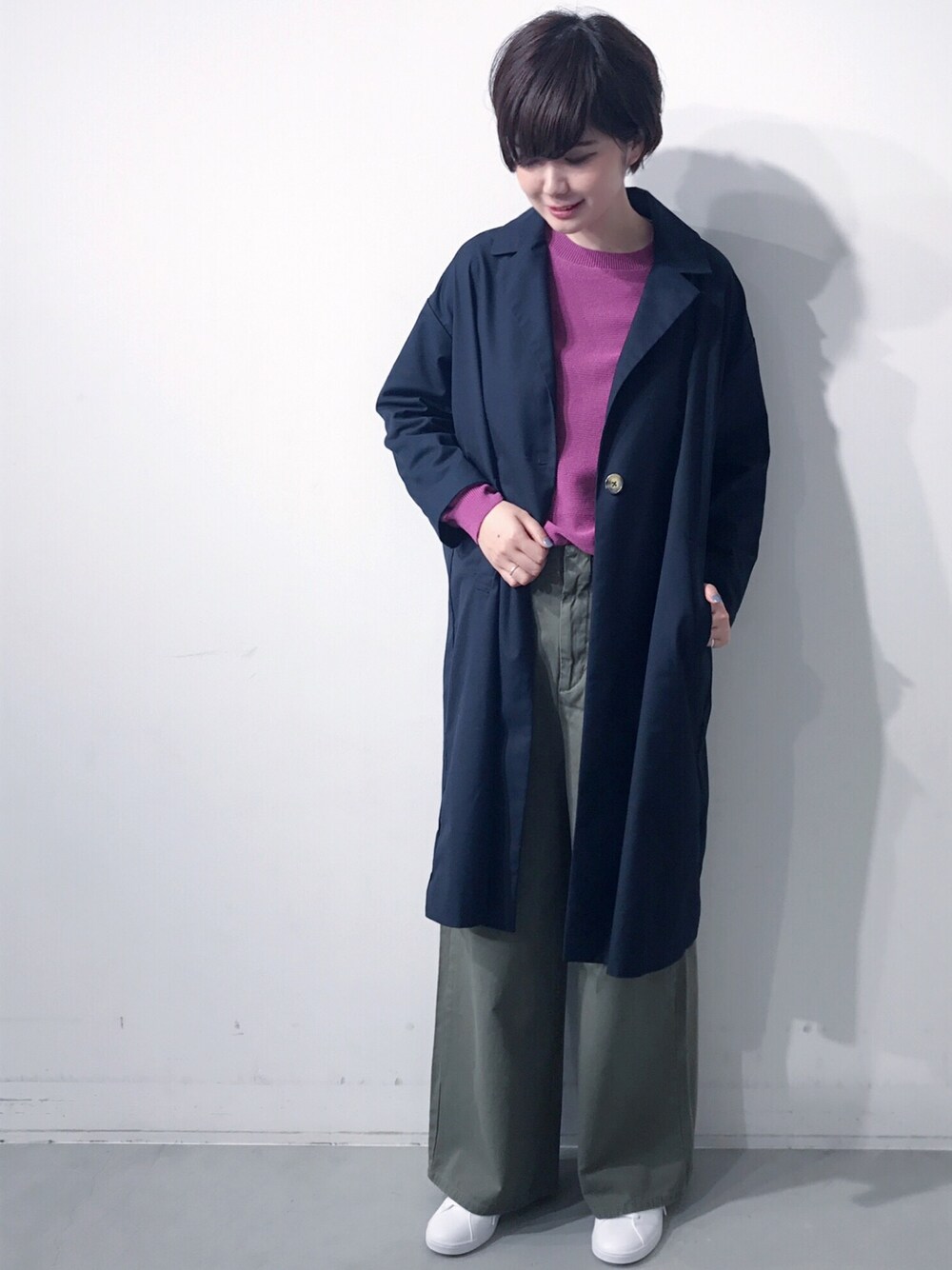 季節の変わり目で寒暖差の激しい日が続きますね、、、 そんな時にも、koeの温度調節ニットがおすすめです! どんよりした天気でも、 鮮やかなパープルを着ると気分があがります〜 チェスターコートはトレンドに左右されずに 着られるので、一着は持っておきたいですね ◎