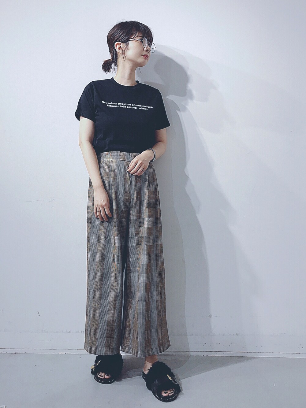 ロゴT × グレンチェックで レトロカジュアルなコーデに。 ワイドパンツはウエストがゴムになっているので リラックスしてはけます ◎ ファーサンダルは今年も トレンド入りしそう 🐰