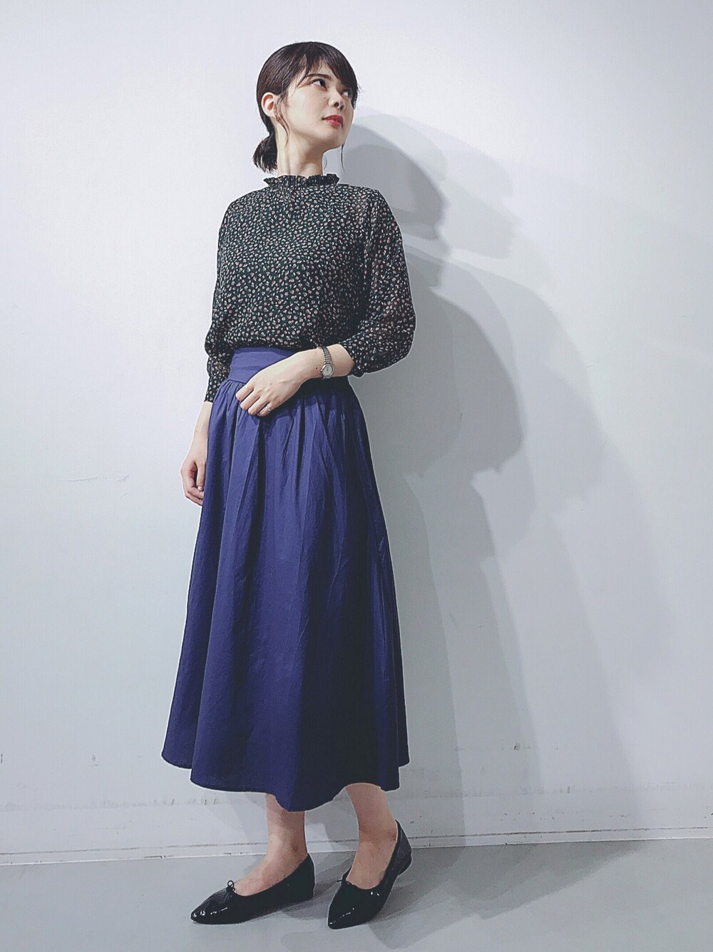 レトロな小花柄のブラウスに 上品なフレアスカートを合わせたコーデは 甘くなりそうな組み合わせですが、 ダークグリーン×パープルの 落ち着いたカラーで合わせているので 大人っぽく仕上がります 🦋 個人的にとってもお気に入りのコーデです♡