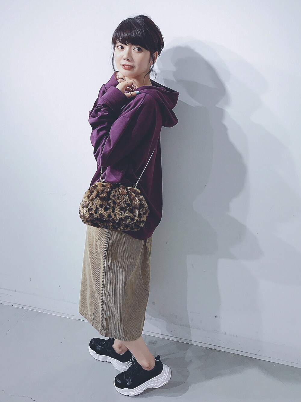 新作の裏毛パーカーは ゆるゆるなシルエットがかわいいです♡ ボトムスはコーデュロイ素材で カジュアルにしつつ、 パンツではなくスカートで 女性らしくしたのがポイントです。 レオパード柄はこの秋冬とっても気になります! 小物なら取り入れやすいです 🐆