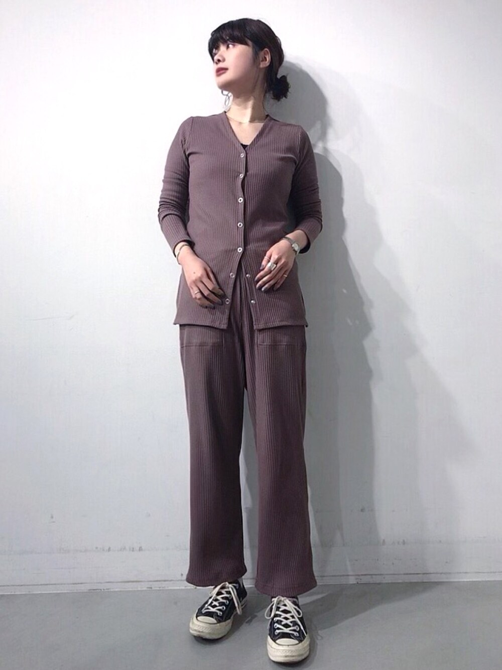 新作のリブカーデとリブパンツ、 カラー表記はグレーですが、 くすみがかかったパープルのような 色合いに一目惚れしました🥰 足元はスニーカーで カジュアルダウンさせるのがおすすめです!